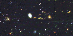 Fotol on kujutatud Hubble Deep Field (Hubble'i kosmoseteleskoobi sügav väli), pildistatud 1995. aasta lõpul. Selle saamiseks eksponeeriti esimesel pilgul täiesti tühjana paistvat taevaala mitme nädala jooksul erinevate filtritega, mis arvuti abil kokkuviidutena annavad värvilise pildi. Selle nähtavate galaktikate enamik asub meist väga kaugel. Nende punanihked, mille järgi saab määrata galaktikate kaugusi, räägivad seda keelt, et fotol näeme peamiselt noori galaktikate populatsioone. Uurides nende heledusi ja tähelist koosseisu, saame informatsiooni galaktikate tekke ja varase arengu kohta. Et uuritava taevaala tegelik läbimõõt on vaid mõni megaparsek, ei saa nii väikesel alal olevate galaktikate abil kindlaks teha nende paigutust makrostruktuuri seisukohast. Viimase ülesande lahendamiseks on asutud täitma teist programmi. Nimelt määratakse üle kogu taeva rohkem kui miljoni galaktika heledused ja kaugused kuni näiva heleduseni umbes 18 tähesuurust. Selle projekti teostamiseks on ehitatud täiesti uus teleskoop ning esimesi tulemusi oodatakse umbes aasta pärast. JAAN EINASTO (1929) on Tartu Observatooriumi vanemteadur. Eesti TA akadeemik. Füüsika-matemaatikadoktor. Varjatud aine ja universumi rakulise ehituse avastaja. esilehele | järgmine lugu |