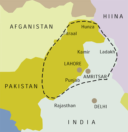 Sikhi impeeriumi ligikaudne ulatus Ranjit Singhi ajal 19. sajandi esimesel poolel koos tänapäevaste riigipiiriidega.